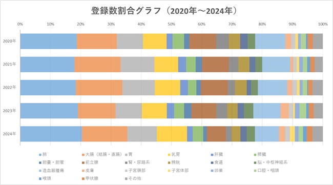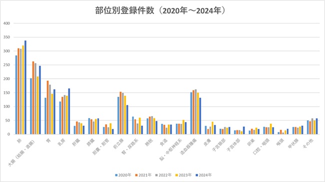 当院において初回の診断・治療がされた腫瘍が対象となります。1腫瘍につき1件の登録となり、他癌の転移や再発症例は含んでおりません。