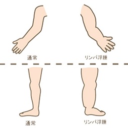 リンパ浮腫とは、何らかの理由でリンパ液の流れが滞ることにより生じるむくみのことです。乳がんや婦人科がん(子宮がん、卵巣がん)、前立腺がんの手術でわきの下のリンパ節、骨盤内やそけい部のリンパ節を切除した後や放射線治療でリンパ節やリンパ管が損傷した場合に起こりやすい症状です。リンパ浮腫はがんの治療を受けたすべての患者さんに発症するものではありませんが、一度発症するとうまくつきあっていくことが必要になります。むくみが軽度であれば改善しやすいですが、重症化すると生活に支障をきたすことがあるため、早い時期に発見し治療を行い、悪化を防ぐことが大切になります。