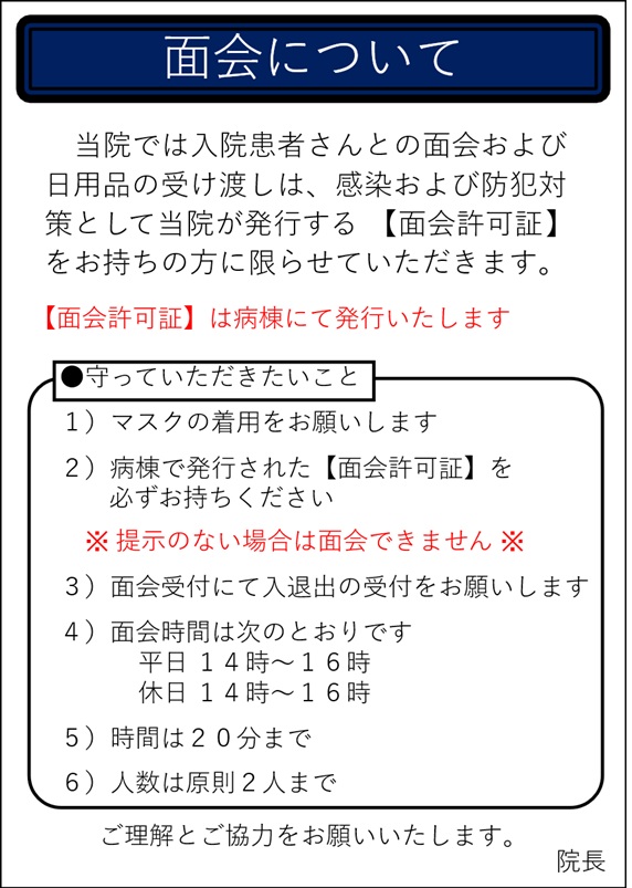 - 面会は、14時~16時の間に許可制で行っております。一階正面のゲートで面会受付をお願いします。